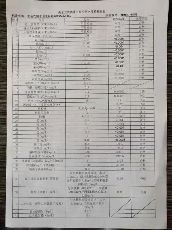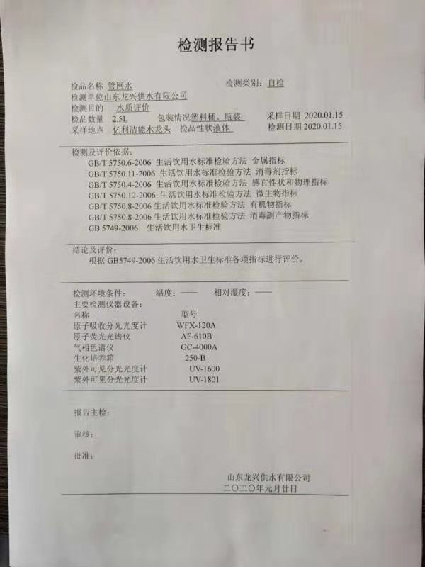 2020年1月億利潔能管網(wǎng)水龍頭水質(zhì)月檢報(bào)告