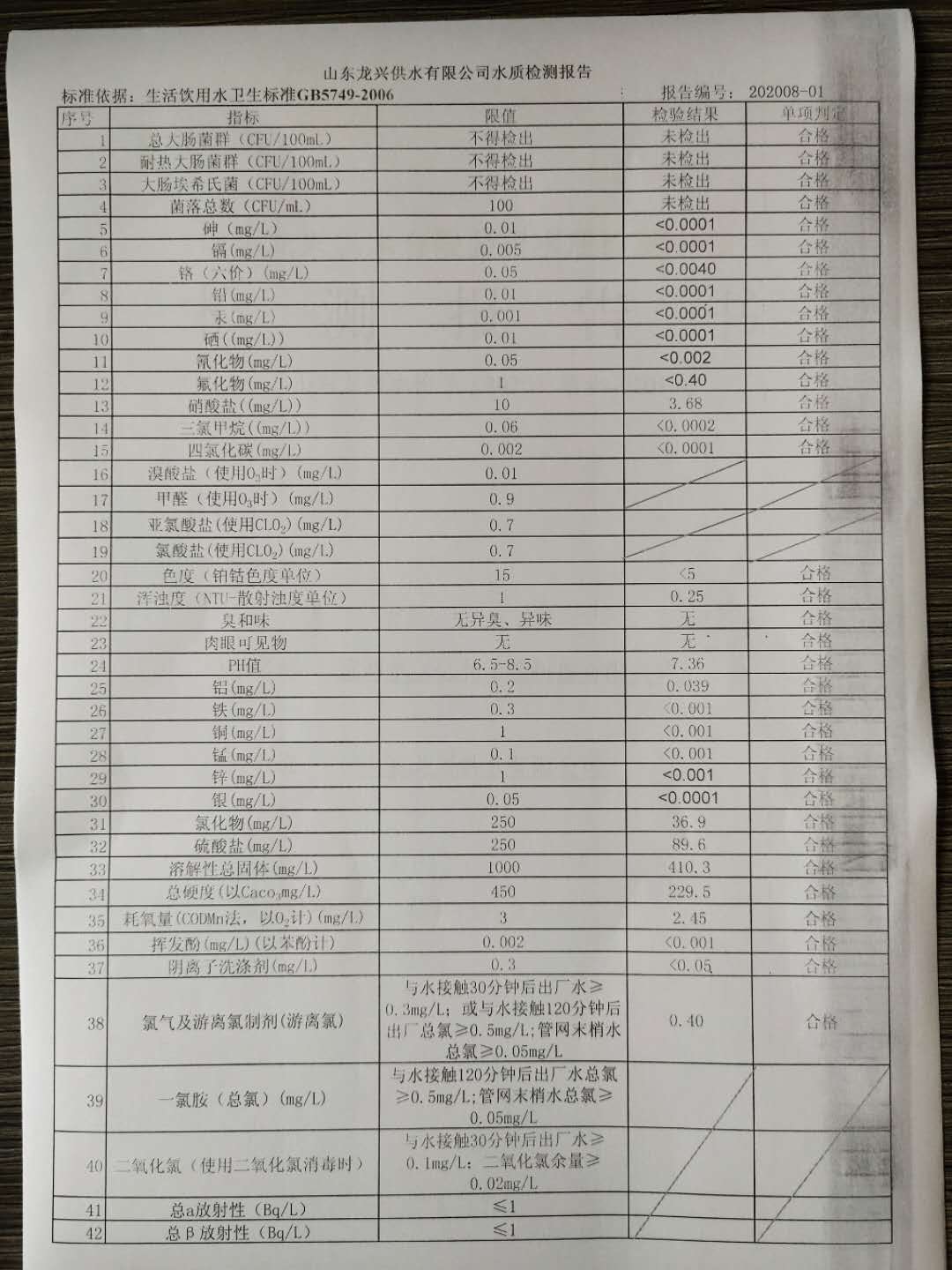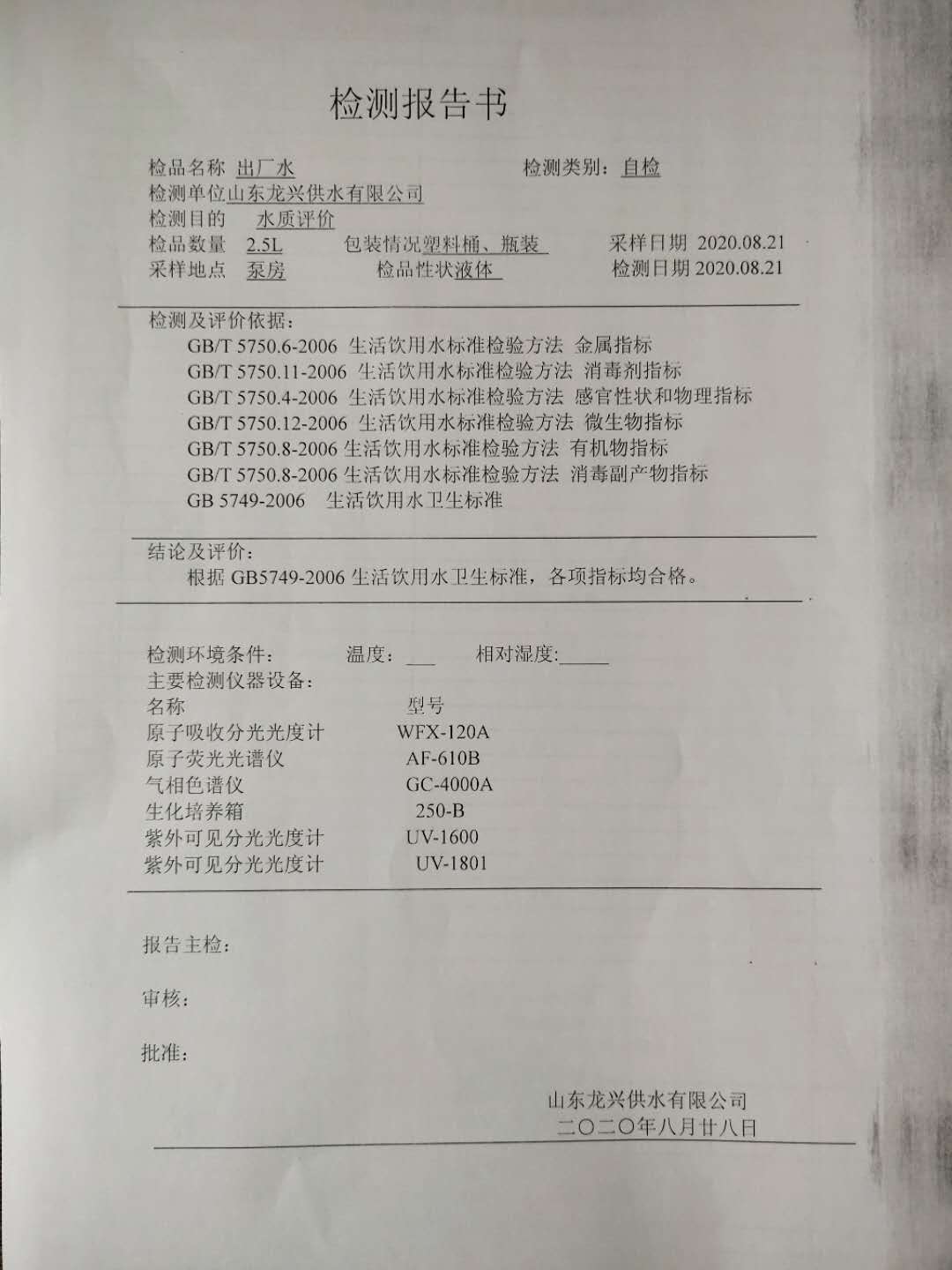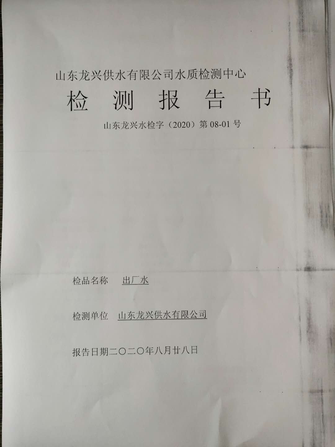 2020年8月出廠水月檢報告